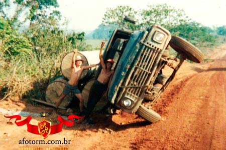 1990 - Local: Linha vicinal. Caminhão Toreiro. Tombado provavelmente por deslocamento das toras e excesso de peso. |